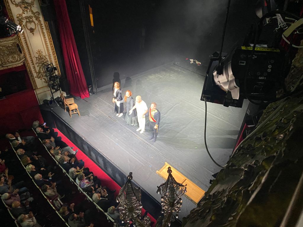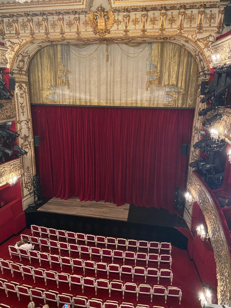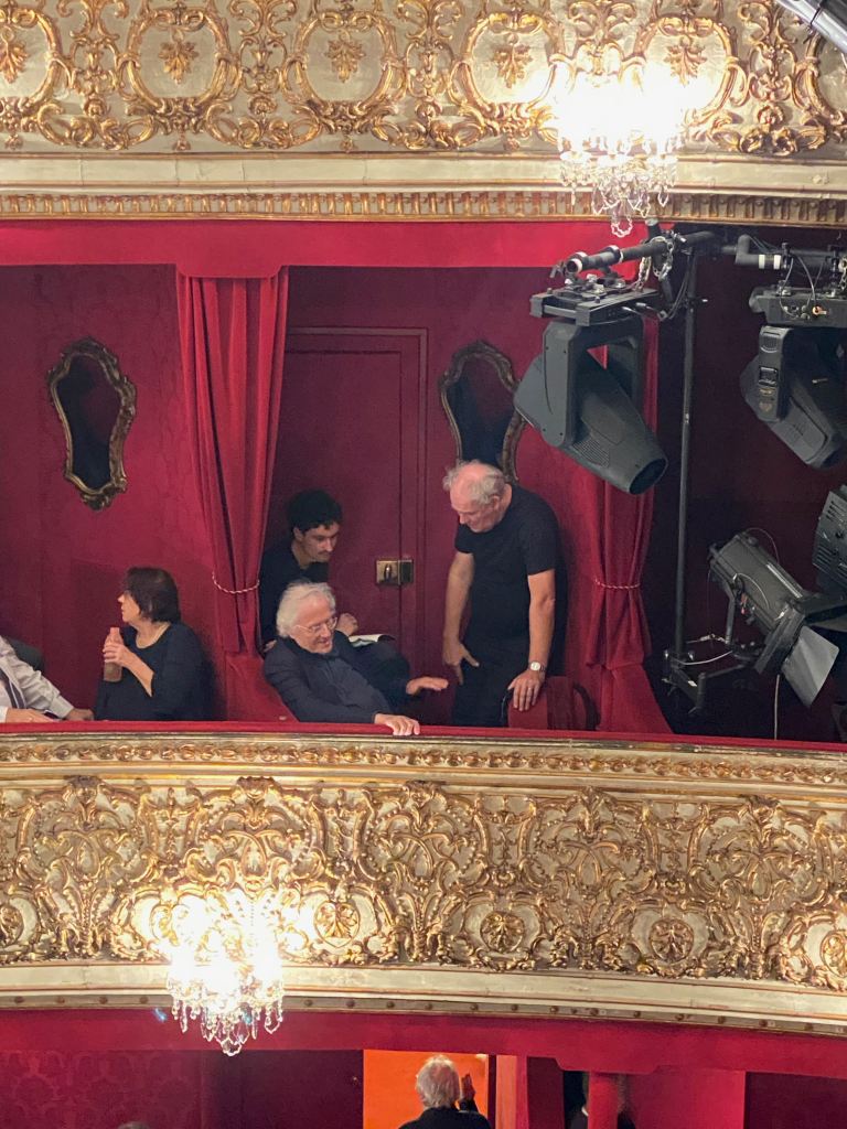 Aus reiner Großmannsucht haben wir uns zwei Plätze erste Reihe Loge rechts Parterre gekauft und wirklich, wunderbare Plätze. Ein Platz hinter uns war verkauft, wer auch immer ihn gekauft hat, er ist nicht aufgetaucht, vielen Dank. In der Loge rumlümmeln hat schon ein anderes Flair als beengt zwischen den Sitzen.