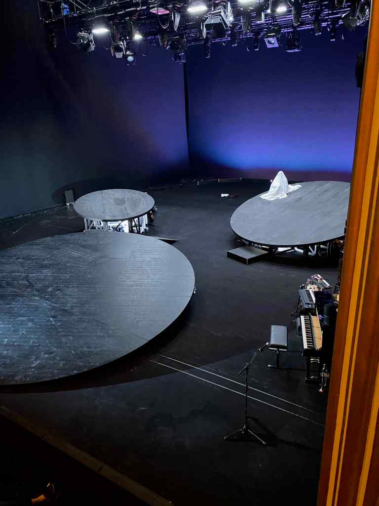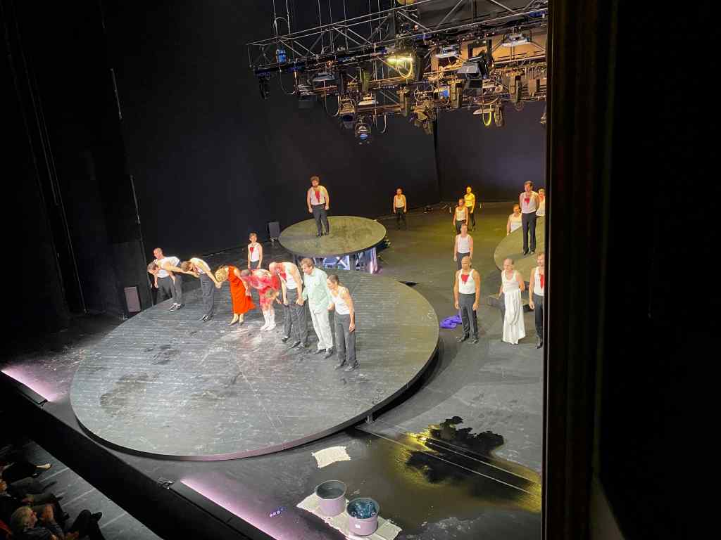 Schön, schön, man sieht gleich mal die Bühne, das Bühnenbild macht mich nicht glücklich. Alles schwarz und dunkelgrau und düster, aha, Einheitsbild fürs ganze Stück, naja. Drei große, kreisrunde, schief angelegte Podien unterschiedlicher Größe, warum, wozu, ich weiß es nicht und die Podien spielen auch keine große Rolle für die Inszenierung, nur die große links vorne wird ausgiebig genutzt. Die intensivste Szene spielt sich rechts vorne fast unscheinbar ab und beinhaltet als Requisiten nicht mehr als zwei Kübel, fast schon armes Theater, nicht unironisch für die teuerste Sprechtheaterbühne Österreichs mit den weitaus größten Möglichkeiten.